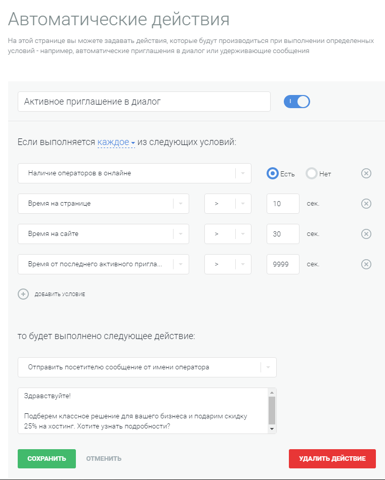 4. Время от последнего активного приглашения – практически бесконечность. Это означает, что если посетитель сознательно закрыл чат, приглашение к диалогу он больше не увидит.