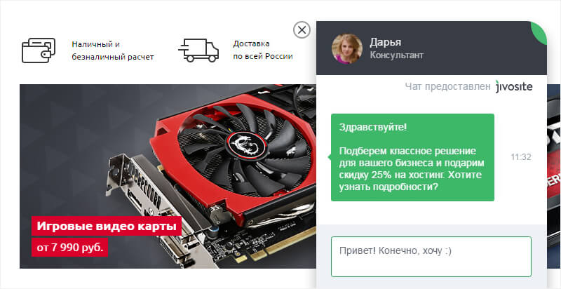 Как видите, настроить онлайн-чат просто: необходимо лишь представить себя на месте пользователя и понять, какое сообщение его может заинтересовать и принести пользу. Клиенты, для которых мы настраивали онлайн-консультант JivoSite, говорят, что на онлайн-чат приходится львиная доля продаж. А для одного из магазинов шин и дисков сервис стал основным каналом – настолько удачно удалось интегрировать его в бизнес-процессы.